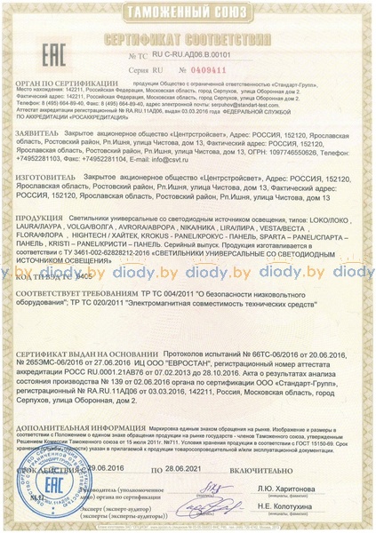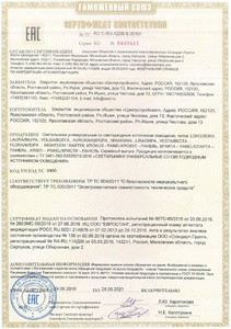 Сведения о безопасности светильников и сертификатах соответствия